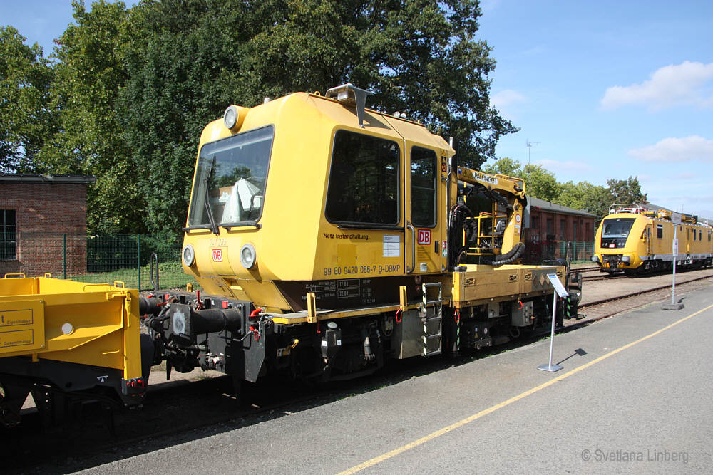 | 99 80 9 420 091-7 D-DBMP Gleisarbeitsfahrzeug GAF 100 R/A DB InfraGO AG, Maschinenpool, Berlin 6 REV GBM-619 (Datum offen) Herst. GBM Brandenburg-Kirchmöser, 20.09.2024 (Tag der Schiene 2024) |