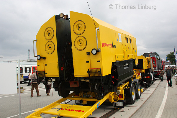 97 32 99 902 50-0 Schienenschleifeinheit RGM Fa. Schweerbau GmbH & Co. KG, Stadthagen 6 REV FW 513 30.03.10 Herst. LORAM (USA) 1120990499 EBA 02E04A001 verladen auf Zweiwegeanhänger 97 59 98 907 50-8 / Zugfahrzeug 97 59 01 551 60-9 Berlin-Messegelände, 21.09.2010 (InnoTrans 2010) |