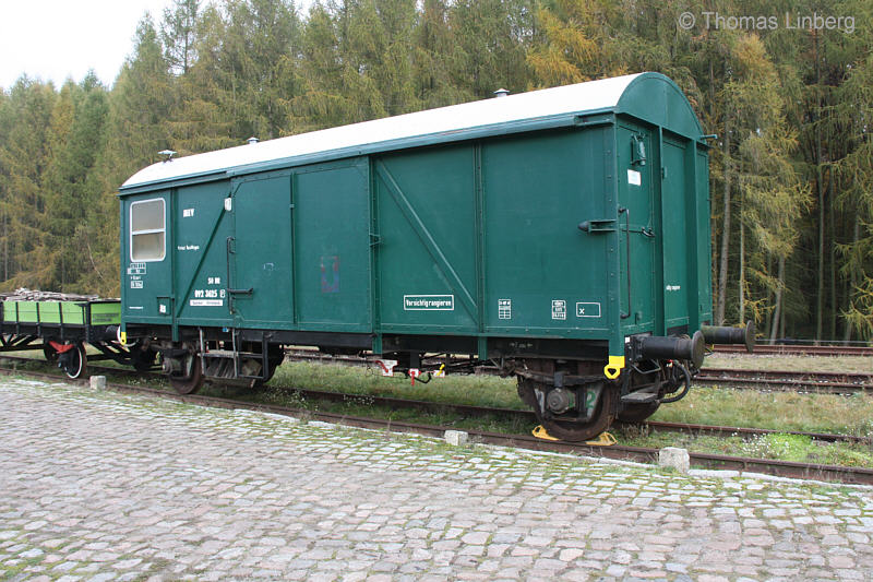 ... und zwar hat sich die Museumseisenbahn Sternebeck des Wagens angenommen und ihn wieder aufgearbeitet. Die Beschriftung mit 50 DR ist zwar nicht original, ebensowenig auch die grüne Farbgebung, aber es ist schön, dass ab und zu auch Güterwagen wieder aufgearbeitet werden. |